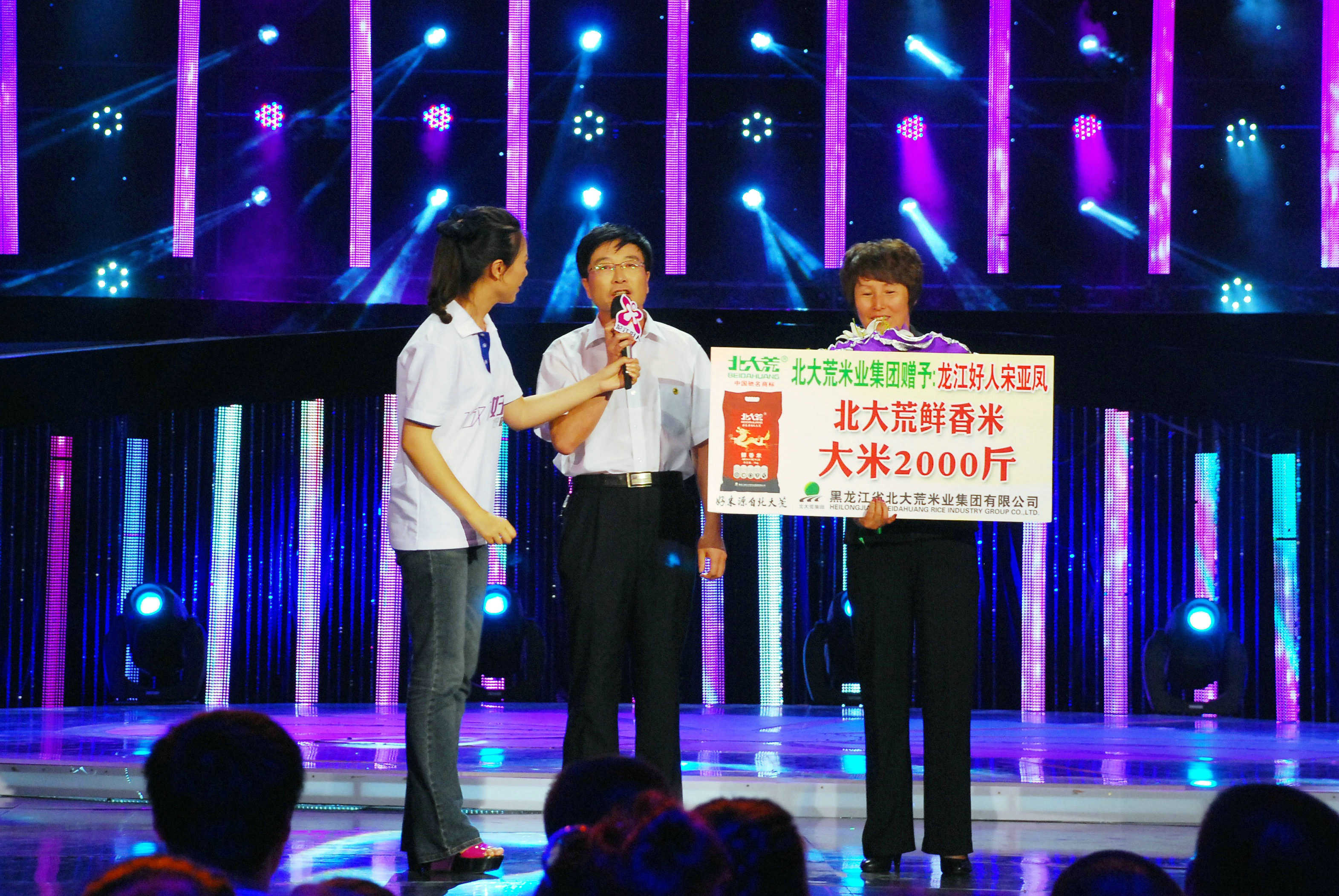 圖:8月1日,在首屆黑龍江省“十大好人”頒獎盛典上,北大荒米業(yè)集團捐助“好人”宋亞鳳吃上了“好米”。