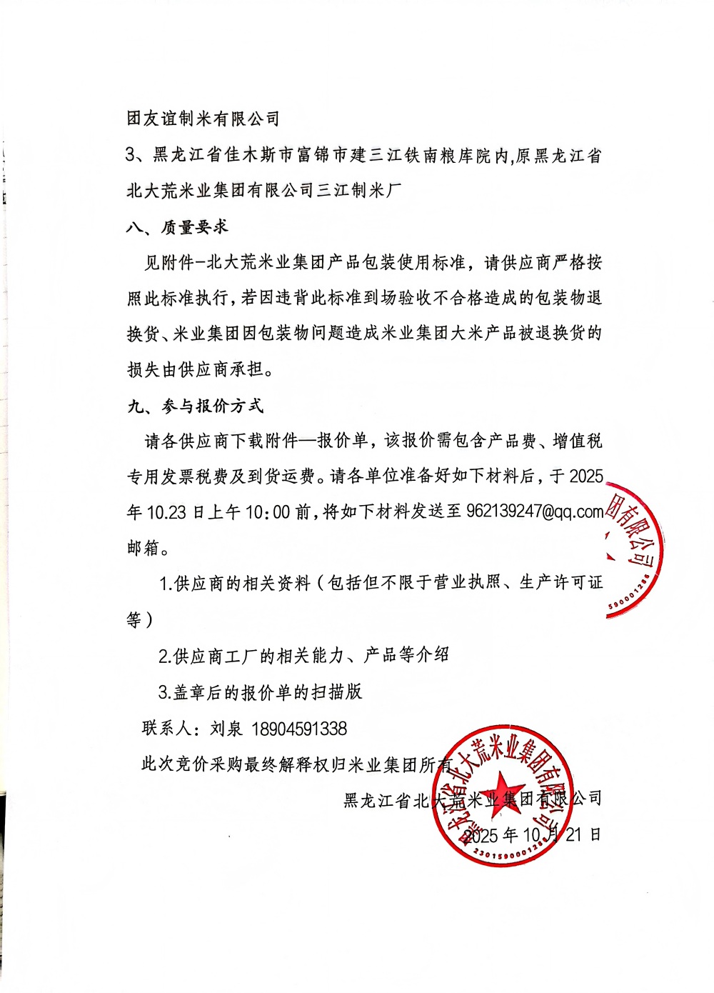 黑龍江省北大荒米業(yè)集團(tuán)包裝物采購(gòu)公告